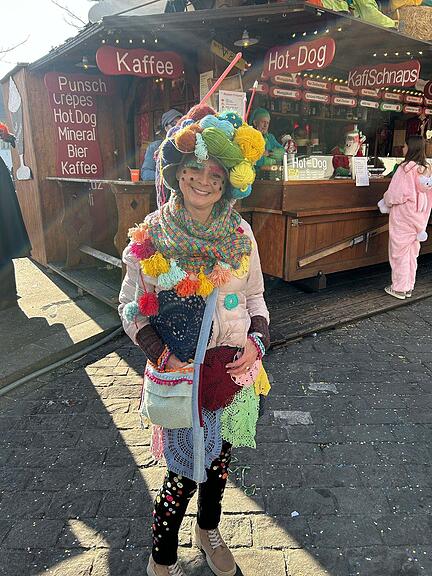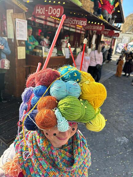 Wenn das mal nicht ein farbenfroher Wollknäuel ist! Regula ist Handarbeitslehrerin und hat ihren Materialschrank leergeräumt. Alle Stricknadeln, jeder Fetzen Stoff, Knöpfe und reichlich Wolle ergaben dieses tolle Kostüm. Vielleicht strickt sie auf dem Heimweg gleich das Kostüm fürs nächste Jahr. Genügend Material hat sie schon mal dabei.