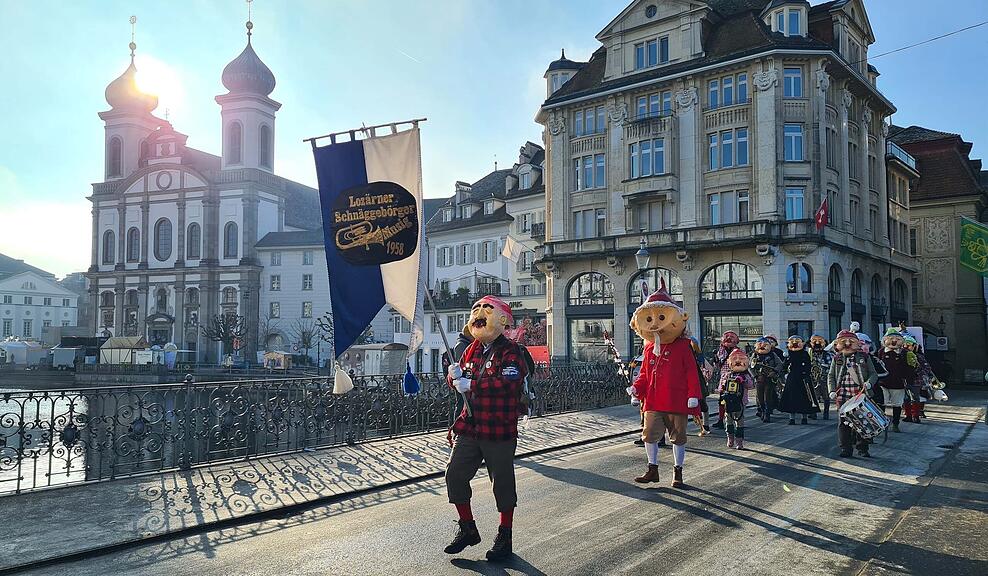Angeführt vom Sandmännchen sorgen die Luzerner Schnäggebörger für rüüdige Stimmung. Entgegen ihrem Schlafmützen-Sujet wird bei diesen Klängen und der fröhlichen Stimmung ganz bestimmt niemand müde.