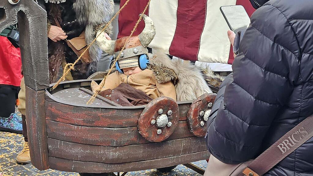 Dass viel Fasnacht müde macht, wissen auch die Grossen. Die Kinder haben hier den Vorteil, dass sie auch mitten im Getümmel ein kurzes Schläfchen machen können, um wieder zu Kräften zu kommen. Herzig: dieser müde kleine Vikinger.