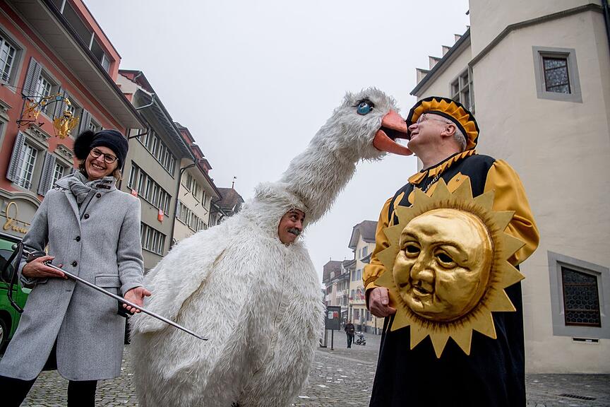 Stadt und Zunft organisieren die Gansabhauet jeweils gemeinsam. Präsident der Gansabhauetkommission ist Stadtarchivar Michael Blatter. Er sagt, man habe den Anlass heuer schweren Herzens absagen müssen. «Eine Gansabhautet light kam für uns nicht in Frage.» Ganz ohne Gans ging’s dann doch nicht: «Mit der Aktion heute Morgen wollen wir ein Zeichen setzen und die Gansabhauet trotzdem sichtbar machen.» Das von Vitus Wey erfundene Ganskostüm ist übrigens nicht neu: Die übergrosse Figur kam bereits 2015 beim Jubiläum der Schlachtjahrzeit zum Einsatz und neckte dort das Publikum.