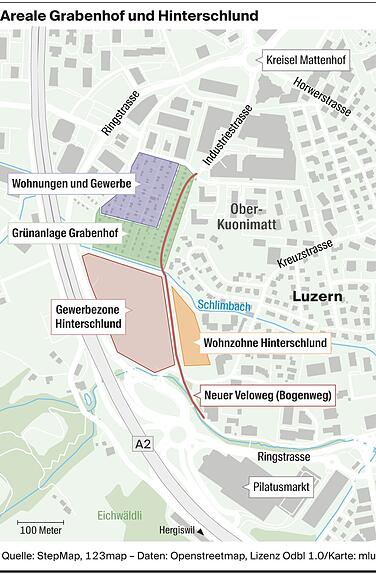 Wie ein L auf dem Kopf und rund 20'000 Quadratmeter gross – so präsentiert sich der künftige Grabenhof-Park im Krienser Schlund-Gebiet aus der Vogelschau. Jetzt ist klar, wer die neue Anlage entwerfen wird: Das Luzerner Büro Freiraumarchitektur Gmbh überzeugt die mit Fachpersonen und Anspruchsvertretungen (etwa für Jugendliche oder das angrenzende Quartier) breit abgestützte Jury mit seinem Projekt «Lucus». Es sticht damit 35 andere Vorschläge beim anonym durchgeführten Wettbewerb aus. Dies sind die wichtigsten Eckpfeiler: