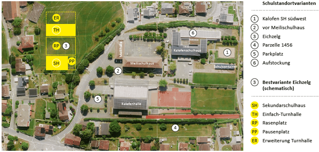 Als beste und zukunftsgerichtete Lösung hat die Gemeinde einen Neubau für ein Sekundarschulhaus samt Einfachturnhalle im Gebiet Eichzelg gegenüber dem heutigen Schulhausareal identifiziert. Der Standort biete ausreichend Platz, beanspruche keine bestehenden Freiflächen und ermögliche Erweiterungen, schreibt die Gemeinde im Projektbeschrieb. Die Gesamtkosten werden auf 18,8 Millionen Franken geschätzt.