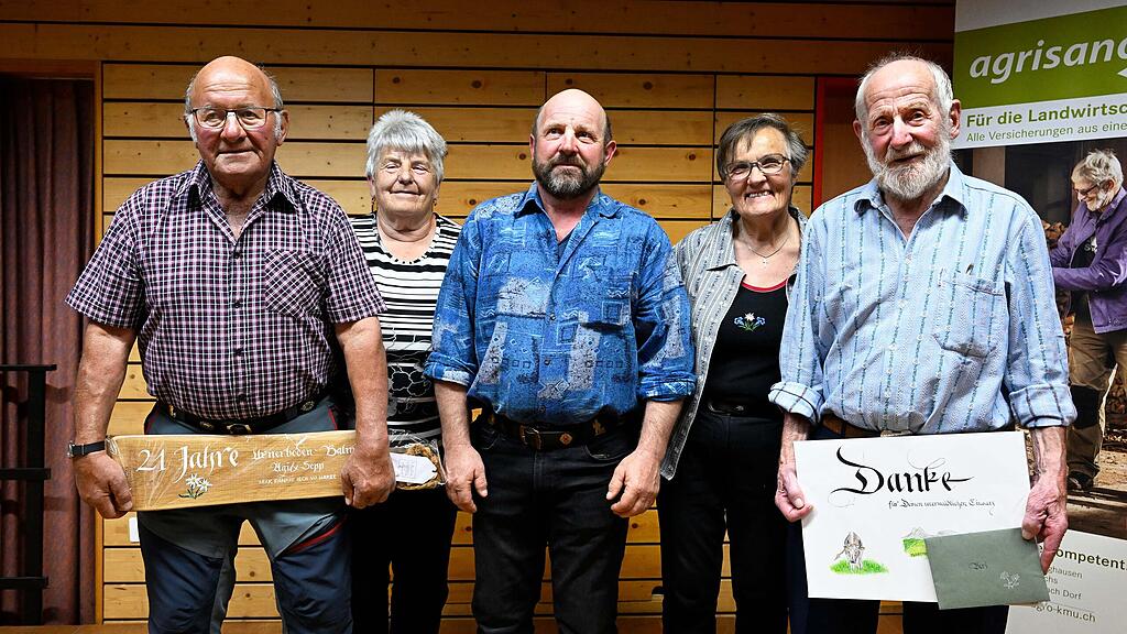 Die geehrten Dienstboten von links: Sepp Arnold, Agi Arnold, Franz Baggenstos, Agatha Landolt und Xaver Bissig (Lüke Veri).