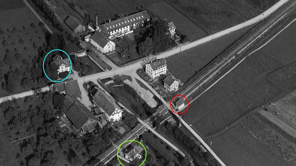 Die Flugaufnahme von Walter Mittelholzer stammt aus den Jahren zwischen 1919 und 1921 – die Strecke ist noch nicht elektrifiziert. Rot markiert die «Schirmhütte» der Haltestelle Kollermühle, grün das Wärterhaus und blau das Gasthaus Kollermühle. Dazwischen die Getreidemühle Weiss (später Galvanikbetrieb Wilhelm) und nördlich rechts der Lorze die «Spinnerei & Weberei Zug A.-G.», nachmalig Gygli.