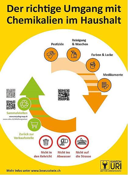 Um die Bevölkerung über den richtigen Umgang mit Chemikalien im Haushalt zu informieren, hat das Amt für Umweltschutz nun eine Kampagne lanciert. In den nächsten Wochen werden Verkaufsstellen, Entsorger und Gemeinden mit Informationsunterlagen bedient. Zudem wird mit Inseraten und einem Versand eines Info-Flyers auf das Anliegen aufmerksam gemacht. Die Kampagne basiert auf der Website www.bewusstwie.ch des Bundesamts für Umwelt.