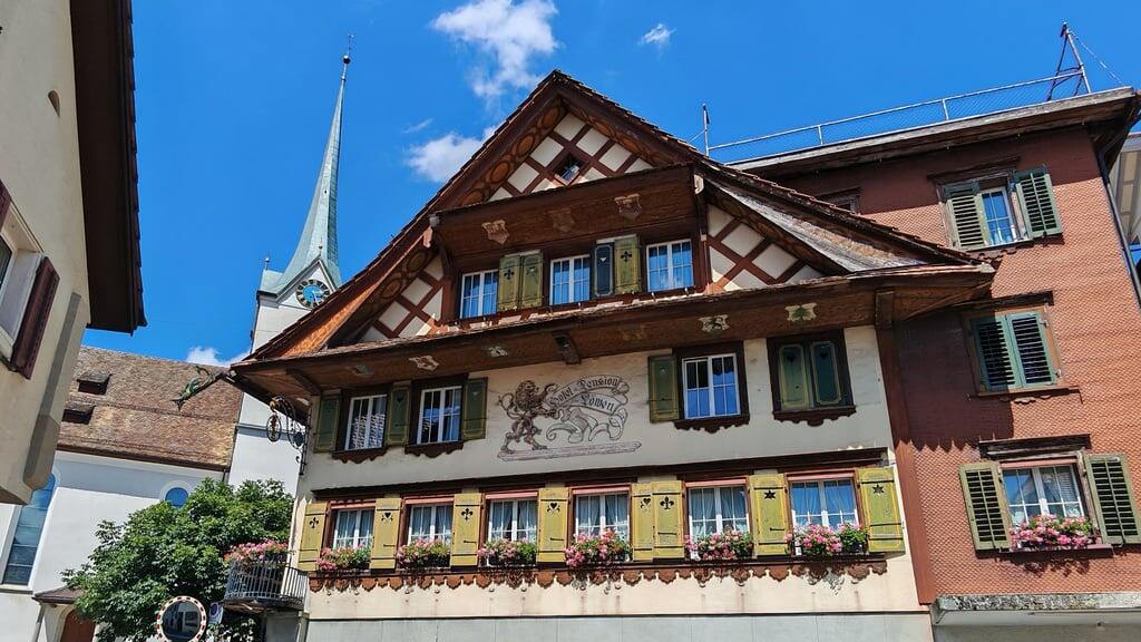 Obschon Menzingen wie andere Zuger Ortschaften in den vergangenen Jahrzehnten stark gewachsen ist und das Dorfbild sich entsprechend gewandelt hat, kann sich die Gemeinde eines in seiner Struktur gut erhaltenen alten Dorfkerns rühmen. Dieser definiert sich neben dem Ensemble mit Pfarrkirche und Beinhaus vor allem durch die Gebäudereihe zwischen den Gasthäusern Ochsen und Löwen.