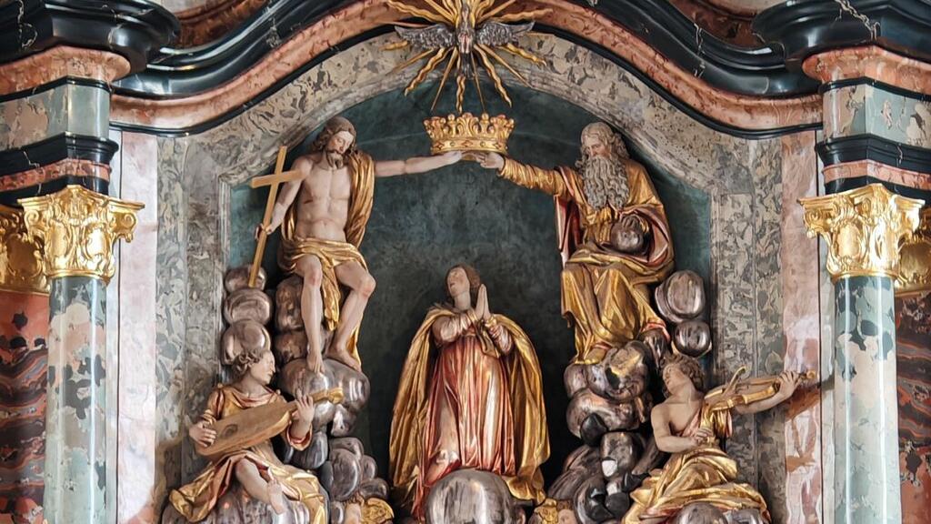 Das grosse Mittelfeld des Altars weist also kein Gemälde auf, wie es mehrheitlich der Fall ist. Stattdessen belebt eine vielköpfige Figurenschar das Zentrum des Retabels. Hinter dem Tabernakel sind die zwölf Apostel gestuft und symmetrisch angeordnet. Sie sind kniend und stehend dargestellt. Darüber prangt eine ebenfalls vollplastisch ausgeführte Himmelfahrt Mariens. Die Muttergottes kniet auf einem Wolkengebilde, blickt nach oben und empfängt die Krone durch die Dreifaltigkeit mit Gottvater, Jesus und dem Heiligen Geist. Musizierende Engel begleiten die Szene.