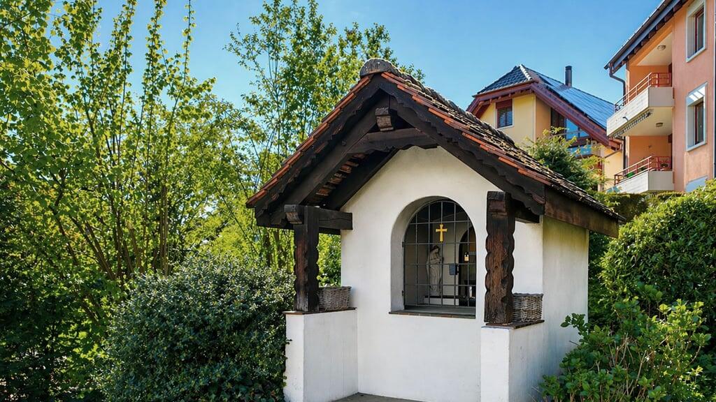 Am Hünenberger Dorfgässli zwischen Dorfstrasse und Sonnhaldenstrasse findet man wenig Historisches. Hier zeigt sich mehrheitlich das neue Hünenberg mit modernen Wohnbauten und Parkfeldern. Einzig eine kleine Wegkapelle, die im Schatten eines grossen Mehrfamilienhauses fast verloren zwischen Buschwerk steht, atmet Geschichte – und diese ist viel älter als das heutige Helgenhäuschen, welches 1930 einen Vorgängerbau ersetzt hatte.