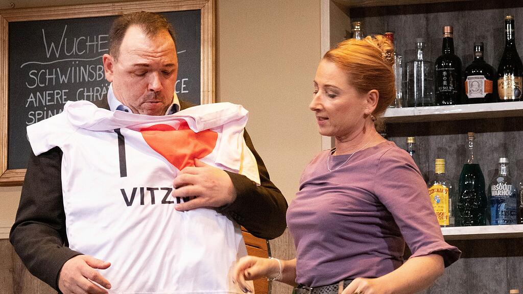 Gemeindepräsidentin Therese Hecht (Noelle Chrisman) drängte Gemeindepräsident Willi Egli (Fosi Stadelmann) das «I love Vitznau»-Fanartikel-T-Shirt auf.