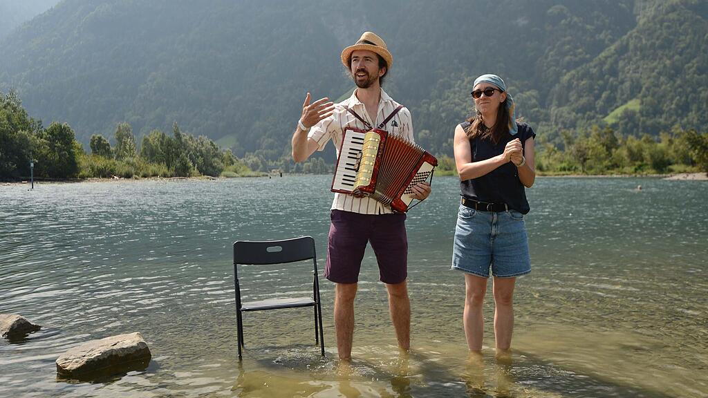 Das ausnahmsweise nur zu zweit präsente Tätsch-Trio hat sich für den Klangspaziergang, mit dem am Sonntag wie gewohnt das Festival Alpentöne im Urner Reussdelta abgeschlossen wurde, einen sehr speziellen Ort für seine Performance ausgewählt. Das Duo steht fast bis zu den Knien im Urnersee und jodelt, was das Zeug hält. Im Nu versammeln sich zahlreiche Zuschauer am Seeufer und hören gebannt zu.