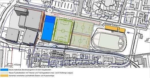 Für den Standort sprechen laut Mitteilung auch die Synergiemöglichkeiten mit den benachbarten Fussball- und Leichtathletikstadien, deren Sanierung in die Planung integriert ist. Als weiterer Vorteil erweise sich angesichts der knappen Landressourcen die Verdichtung an einem bereits bebauten Ort, «ohne dass bestehende Sportflächen reduziert werden müssen».
