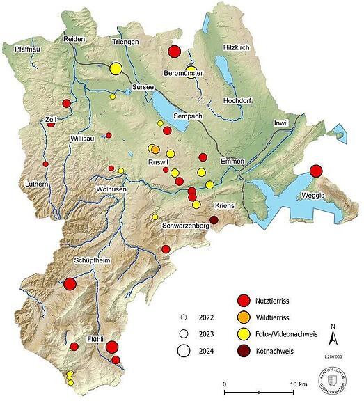 Im letzten Jahr wurden im Kanton Luzern sechs Wölfe gesichtet. Diese konnten durch Nutztierriss oder Foto-und Videoaufnahmen nachgewiesen werden. Aufgrund der aktuellen Entwicklung in der Schweiz (2021: 15 Rudel, 2022: 24 Rudel; www.kora.ch ) ist aber auch zukünftig mit einer vermehrten Wolfspräsenz im Kanton Luzern zu rechnen. Rudelbildungen können dabei nicht ausgeschlossen werden. ( bsa )
