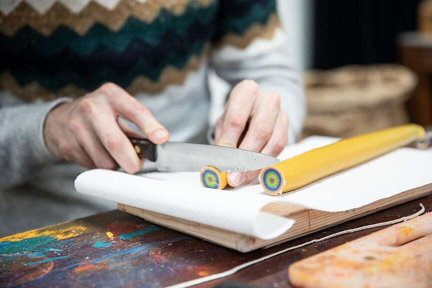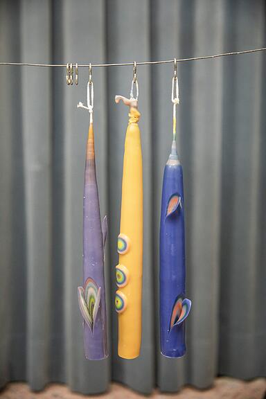 Der Docht wird beim ersten Mal rund zehn Sekunden in flüssiges Wachs, das in mehreren beheizten Kübeln bereitsteht, getaucht. Anschliessend wird er im Wasser gekühlt. Dann folgt ein wichtiger Schritt. Mit einem weichen, saugfähigen Tuch wird der eingewachste Docht von oben nach unten abgetrocknet. Dann wird er wieder kurz ins Wachs getaucht. Erneut muss der Rohling gekühlt und abgetrocknet werden. Zwischen den verschiedenen Farben kann abgewechselt werden. Mit der Zeit kommt man in seinen ganz eigenen Trott. Am Ende der Kerze bildet sich mit der Zeit eine Art Zapfen, der am Schluss abgeschnitten wird. Dies ist immer ein besonderer Moment, denn dabei kommen alle Farbschichten wie Jahrringe eines Baums zum Vorschein. Mit den Abschnitten können die Kerzen beliebig verziert werden. Die Kerze kann, wenn sie noch etwas weich ist, auch aufgeschnitten oder in farbigen Wachsstückchen «paniert» werden.