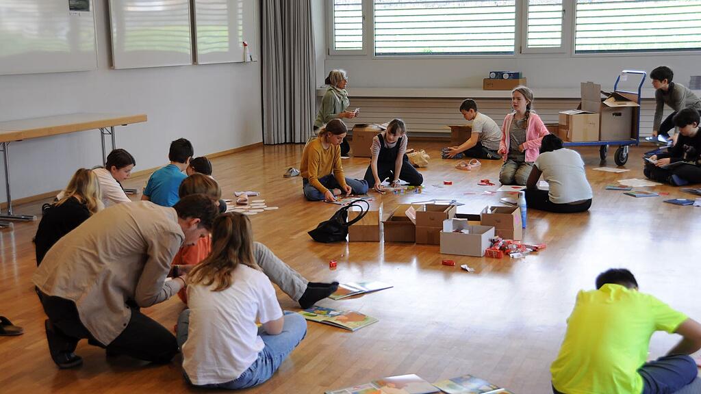 Kleben für einen guten Zweck: Primarschulkinder stellen Kinderbücher für Flüchtlinge fertig