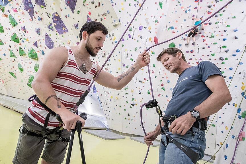 Als Olivier Ineichen mit seinen Krücken die Treppe zu den Kletterwänden herunter geht, verfolgen ihn erstaunte Augen. Sein heutiger Kletterpartner Daniel Spörli, Geschäftsführer von Pilatus Indoor, hilft ihm, den Klettergurt anzuziehen – das ist aber auch der einzige Unterschied zu den anderen Kletterern. Gegenseitig überprüfen sie einander. Dann klettert der 26-Jährige los, natürlich ohne seine Krücken. Behutsam und kontrolliert platziert er seine Füsse auf den Tritten. Daniel Spörli bemerkt:
