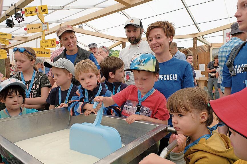 Derweil drängen die Mädchen und Buben von der Naturspielgruppe an das Käsekessi. Alle wollen hautnah miterleben, wie ein Käse entsteht. Milchtechnologe-Lehrling Lukas Rempler zeigt ihnen die Schritte bis zum fertigen Bergkäse. Dabei gibts auch Gelegenheit, selber Hand anzulegen und die Milch mit einer Kelle aufzurühren.