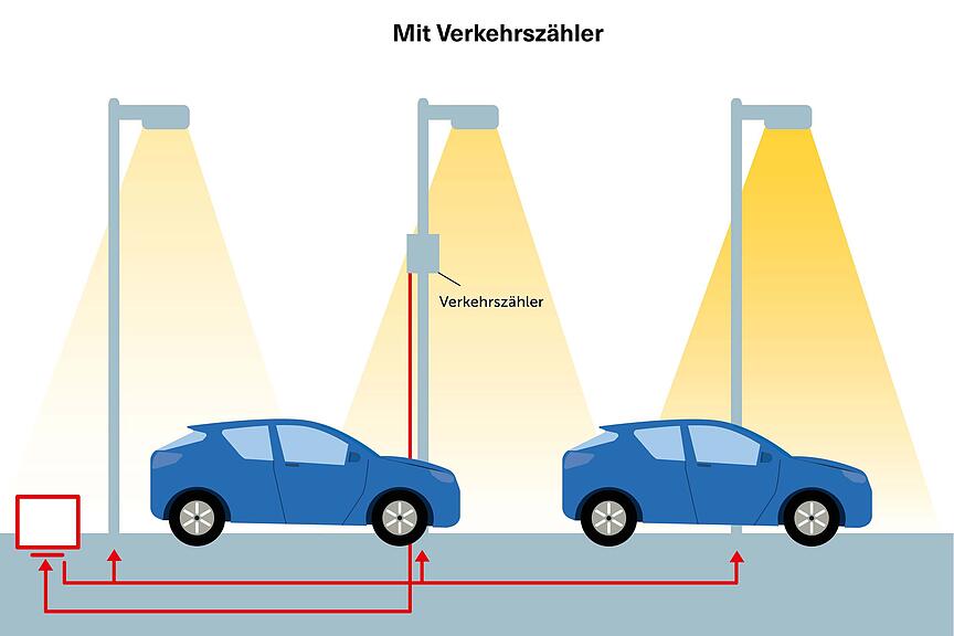 Der Testbereich erstreckt sich in der Bruchstrasse vom 3. bis zum 28. Februar von Hausnummer 5 bis 35. In der Dreilindenstrasse wird vom 3. bis zum 31. März eine verkehrsabhängige Steuerung getestet. Ein Verkehrszähler passt die Beleuchtungsintensität an. Bei geringem Verkehrsaufkommen wird die Beleuchtung auf die niedrigste Stufe gedimmt, bleibt jedoch stets aktiv. Die Systeme funktionieren vollständig autonom und ohne externen Eingriff.