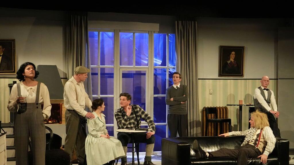 Kommissar Toller (am Tisch sitzend, Dominik Gasser) nimmt alle Gäste ins Verhör, aber auch Monika Reisler (ebenfalls am Tisch, Myriam Vogler) und ihren Mann Gilbert (Bruno Schallberger, hinter ihr).