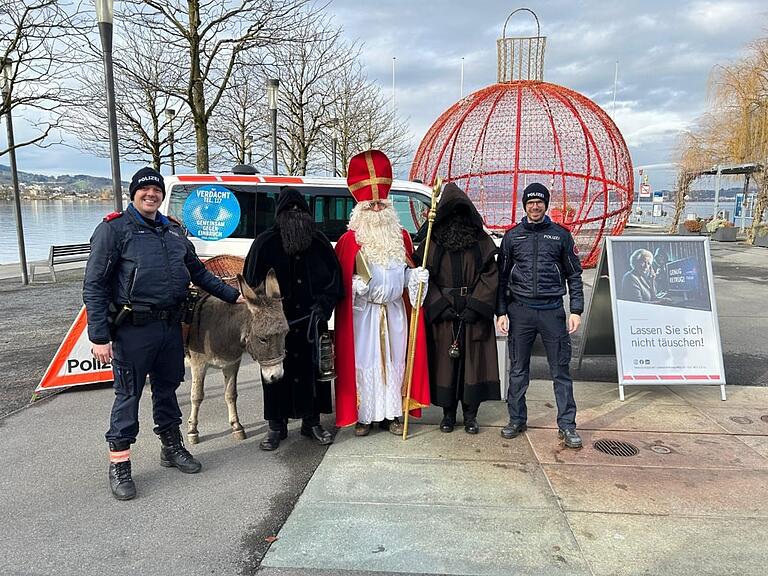 In Lachen rückten am 6. Dezember nicht nur Polizisten aus – auch Samichlaus, Schmutzli und ein Esel begleiteten die Polizisten auf einer besonderen Patrouille. Zwischen Lichterglanz und Adventsstimmung erinnerten sie daran, dass Telefon- und Computerbetrüger keine Feiertage kennen. Die Botschaft: ruhig bleiben, keine Daten preisgeben – und die Adventszeit trotz allem geniessen.