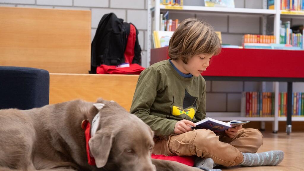 Ruhig liegt Ravi auf seiner Decke. Neben ihm sitzt der neunjährige Aineas mit einem Buch auf den Knien. Er stockt kurz, sucht nach dem richtigen Wort. Der Labradorrüde hebt den Kopf, schaut aufmerksam – ohne Druck, ohne Bewertung. Aineas holt kurz Luft – und findet zurück in den Lesefluss. Genau darum geht es.