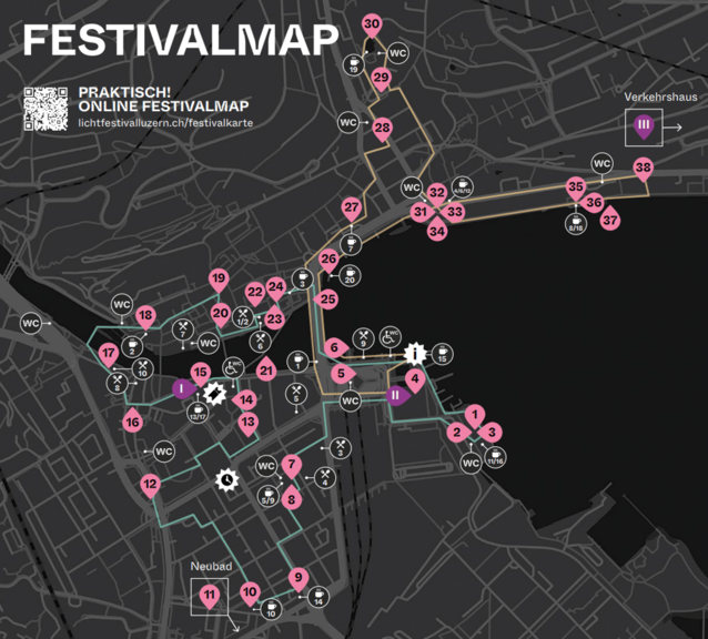 In der Stadt werden insgesamt 38 Lichtinstallationen im öffentlichen Raum zu sehen sein. Auskunft über die Standorte gibt die interaktive Festivalkarte auf der offiziellen Lilu-Webseite. Etwas mehr Übersicht bietet der Festivalflyer, der online auch als PDF verfügbar ist.