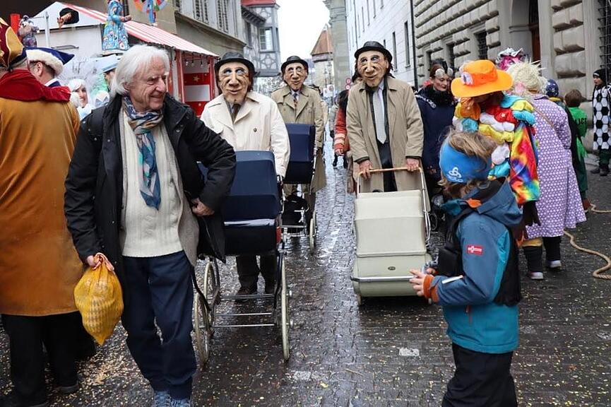 Mit ausdrucksstarken Masken des «jungen» Emil und einer Reihe nostalgischer Kinderwagen zogen die Fasnächtler die Blicke auf sich. Aus den Wagen dröhnte lautstark die bekannte Kinderwagen-Nummer, in jedem lag zudem ein kleines «Oskarli» – eine augenzwinkernde Hommage an Emils Kultnummer aus den 1970er-Jahren. Als Höhepunkt und zum Staunen mancher Zuschauer am Strassenrand fädelte sich Emil Steinberger (93) für rund eine Viertelstunde in den Wey-Umzug ein.