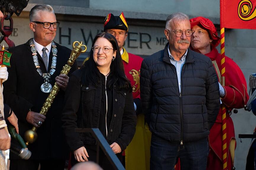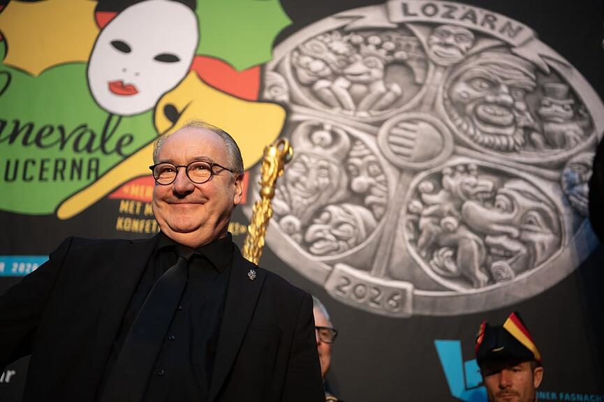 Um 16.50 Uhr wird das Geheimnis gelüftet und hinter den (noch) amtierenden Fasnachtsgewaltigen, die in corpore erschienen sind, ein Riesenplakat hochgezogen. Die darauf abgebildete Siegerplakette «s’ LFK jubiliert» ist quasi viergeteilt und zeigt je ein Sujet der vier tragenden Zünfte und Gesellschaften: Zunft zu Safran, Maskenliebhaber-Gesellschaft (MLG), Fidelitas Lucernensis und Wey-Zunft. Denn das LFK feiert 2026 seinen 75. Geburtstag. Und damit nicht genug: Vor 100 Jahren wurde in Luzern überdies die erste Plakette herausgegeben.