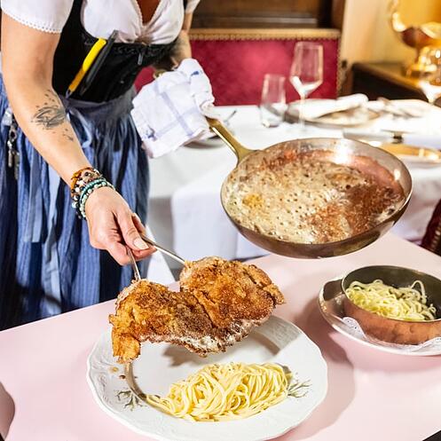 - Zuerst brät er die Chögeli zusammen mit klein geschnittenem Kalbfleisch an. Er stellt dieses anschliessend beiseite.