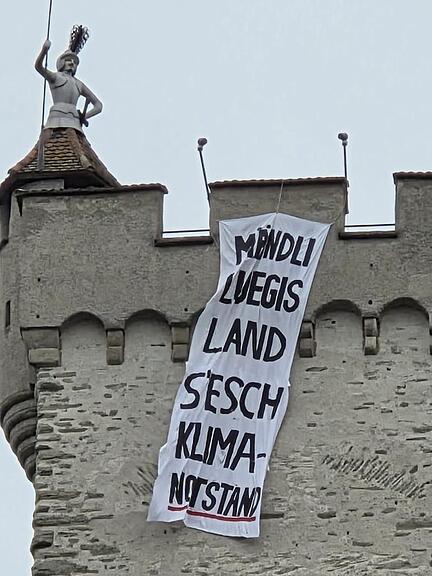 Seit dem frühen Samstagmorgen hängt ein Schriftzug vom Luzerner Männliturm. Wie uns eine Person aus unserer Leserschaft mitteilt, ist darauf der Satz «Mändli lueg is Land s'esch Klimanotstand» zu lesen.