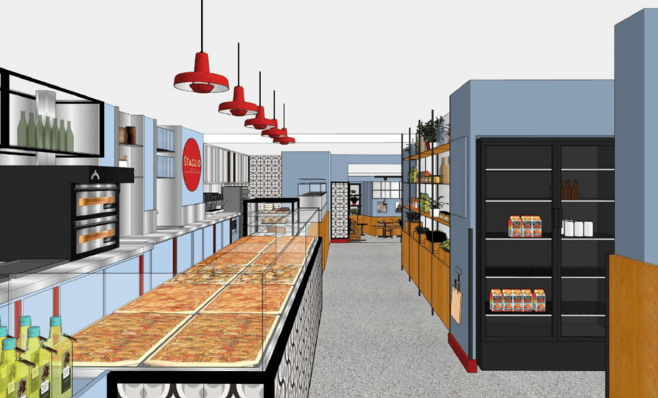 Gemäss einem Baugesuch auf der Website der Stadt Luzern soll im vorderen Teil des Lokals die lange Theke Platz finden. Gebacken werden die Pizzen in zwei elektrischen Pizzaöfen. Damit man die Pizzen auch vor Ort essen kann, ist im hinteren Teil ein Essbereich vorgesehen. Dieser umfasst 31 Sitzplätze in Form von Sitzbänken und bestuhlten Tischen. Ferner sind vor dem Lokal auf dem Hirschenplatz 16 Sitzplätze geplant.