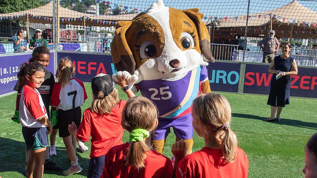 Es ist Mittwochmorgen, kurz vor neun. Bunte Fahnenbänder hängen quer über den auf Fussball getrimmten Europaplatz in Luzern und Musik tönt aus den Boxen. Bereits trudeln erste Besucherinnen und Besucher in der Luzerner Fanzone zur Uefa Women's Euro ein. Erste Schulklassen drängen sich ebenfalls auf die Tribüne – vor dem KKL ist die Aufregung langsam spürbar. Jetzt beginnt das vielfältige, elftägige Programm.