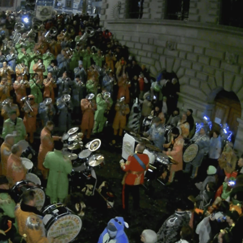 Während sich Bruder Fritschi und sein Gefolge zum gleichnamigen Brunnen bewegen, werden sie von der Fasnachtsmenge lautstark begrüsst. Gemeinsam mit der Guugenmusik schmettern die Frühaufsteher ein «Halleluja» hin. Zu Fasnachtsbeginn spielt die Guugenmusik noch Konzertreif, mal schauen, ob das über die Tage so bleibt. 🙃
