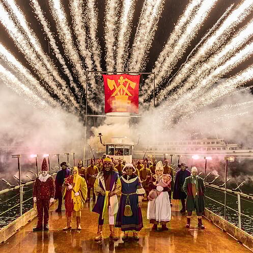 Urknall über dem Luzerner Seebecken, die Guuggenmusik beginnt zu spielen - welch ein Spektakel! Bruder Fritschi und die Fritschifamilie haben mit dem Nauen am Schweizerhofquai angelegt. Der Tross ist auf dem Weg zum Kapellplatz. Bald kommt der Fötzeliräge!