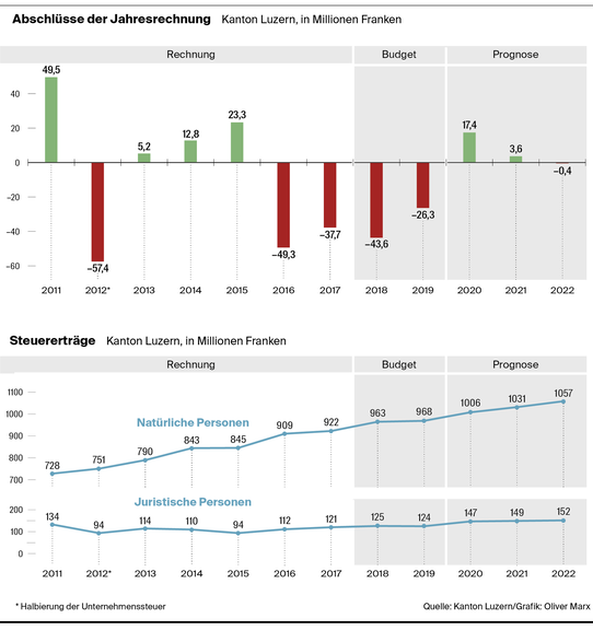 Seit sechs Jahren macht der Kanton Luzern finanziell düstere Zeiten durch. Nach Halbierung der Unternehmensgewinnsteuern 2012 entwickelten sich die Steuereinnahmen nicht wie erhofft. Dann folgten Einbrüche bei den Einnahmen aus dem nationalen Finanzausgleich und schmerzhafte Sparpakete). Nun verkündet Finanzdirektor Marcel Schwerzmann (parteilos): «Die Finanzlage hat sich aufgehellt.» In Zahlen: Für 2018 wurde ein Minus von 43,6 Millionen Franken budgetiert, gemäss Hochrechnungen verringert sich dieses Defizit nun um 9,3 auf 34,3 Millionen. Die rote Zahl soll nächstes Jahr noch heller werden: Das Budget sieht für 2019 ein Minus von 26,3 Millionen Franken vor. In den folgenden Jahren sollen sogar wieder Ertragsüberschüsse folgen: Für 2020 ist ein Plus von 17 Millionen veranschlagt, für 2021 eines von 3,6 Millionen. Im Jahr 2022 soll mit minus 0,4 Millionen «eine rote Null» resultieren (siehe Grafik).