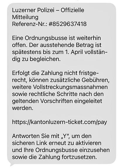 Seit Mittwochmorgen sind bei der Luzerner Polizei mehrere Meldungen eingegangen, wonach Personen SMS-Nachrichten im Namen der Luzerner Polizei erhalten haben. In diesen Nachrichten wird geltend gemacht, dass eine Ordnungsbusse offen sei und die Zahlungsfrist in Kürze ablaufe, teilt die Luzerner Polizei am Donnerstag mit. Die SMS enthalten zudem einen Link zu einem angeblichen Online-Portal der Luzerner Polizei, über welches die Zahlung der Busse erfolgen soll. Dabei handelt es sich jedoch um Fälschungen und somit um einen Betrugsversuch.