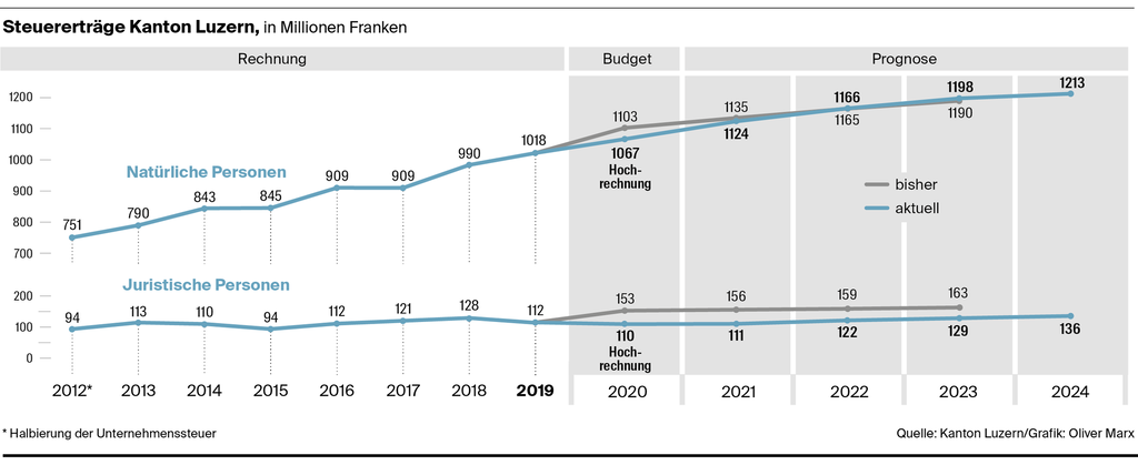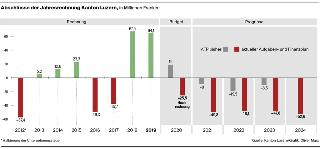 «Spare in der Zeit, so hast du in der Not.» Für die Finanzen des Kantons Luzern bedeutet dieses Sprichwort: Dank Riesenüberschüssen 2018 und 2019 von jeweils über 60 Millionen Franken muss die Regierung vorderhand weder Sparpakete schnüren noch die Steuern erhöhen. Sie kann sich bis 2024 gar jährliche Defizite von durchgehend rund 50 Millionen leisten:
