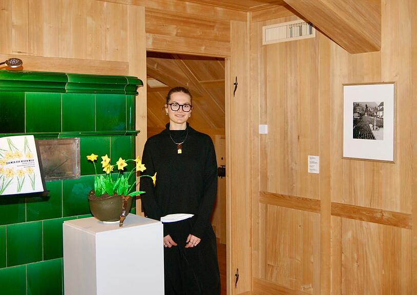 Oben im Museum hat Josephine Herdener die Fotografie «Defilée eines Regiments. Dorfplatz Stans» von Leonard von Matt (1944) ausgewählt und sich vom Bild zu einer Plastik mit dem Titel «Blumen der Neuen Welt» inspirieren lassen, die aus einem Militärhelm besteht, aus dem sieben gelbe Narzissen aus Draht herauswachsen. Sie symbolisieren die Hoffnung, dass nach Kriegen – nach Meinung der Maturandin gilt das auch für die aktuelle Lage – eine neue Weltordnung entstehen werde.