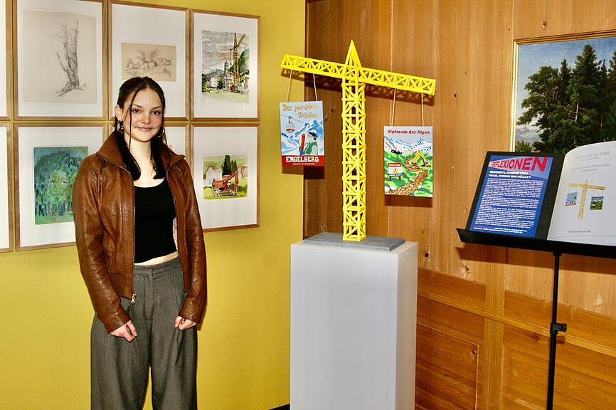 Sheryl Christen benutzte das Aquarell «Landschaft mit Baukran» von Liselotte Moser aus dem Jahr 1967 im 1. Obergeschoss als Inspirationsquelle für ihre Installation «Was, wenn sie fällt?», die sowohl ein hölzerner Kran als auch eine Waage sein kann. Für die Waage spricht, dass an den Armen zwei von der Maturandin gemalte Bilder befestigt sind. Das linke zeigt eine idyllische Werbung für das winterliche Engelberg, das rechte, das tiefer hängt, präsentiert eine Berglandschaft, die durch eine unkontrollierte Bautätigkeit zerstört wird.