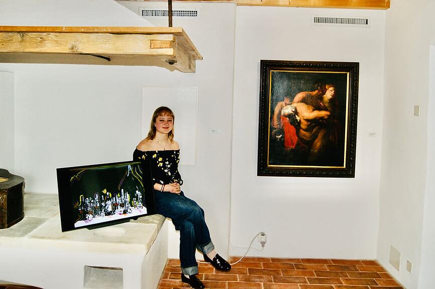 Erst auf den zweiten Blick bringt man die Fotoanimation «Wer übernimmt die Verantwortung?» von Sandra Gisler mit dem daneben hängenden Gemälde «Trunkener Silen mit Faun und Bacchantin» von Anthonis van Dyck (um 1620) in Verbindung. Dabei passt das bewegte, futuristisch gestaltete Stillleben mit Flaschen, Gläsern und Trauben perfekt zum übermässigen Alkoholkonsum, den die Maturandin stellvertretend für unsere Ressourcenverschwendung anprangert