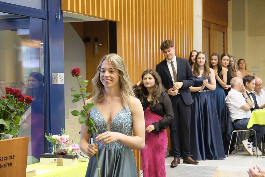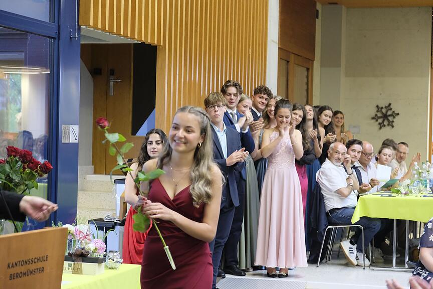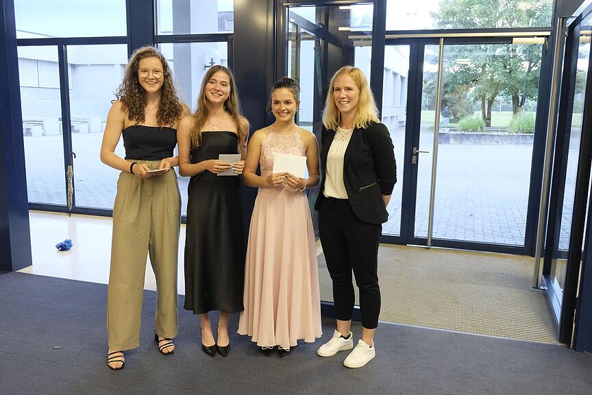 Die besten drei Maturandinnen (Larissa Krummenacher, Zoe Brun, Salome Ehrler, vlnr) erhielten von Fabienne Andermatt (Ehemaligen-Verein der KSB, rechts) den Don-Bosco-Preis für die besten Abschlüsse des Jahrgangs 2023.