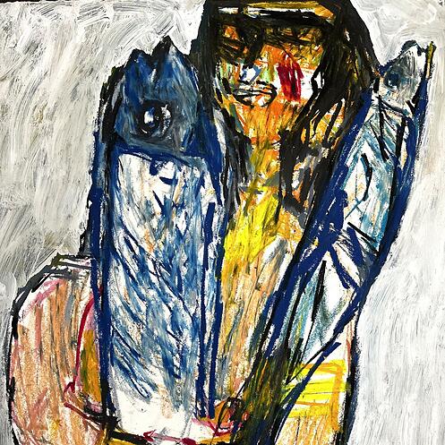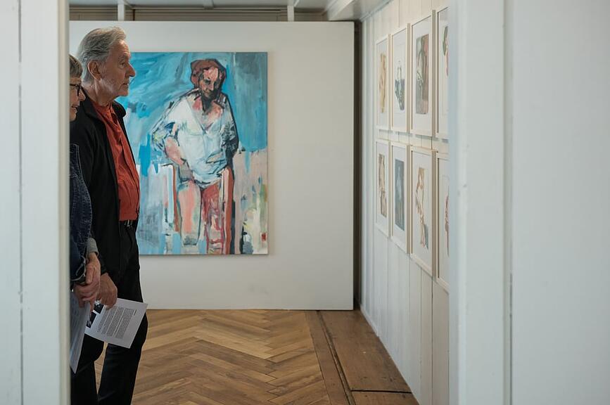 Ganz anders ist das grossformatige Bild im angrenzenden dunklen Raum entstanden: «Zwei Köpfe und mehr», heisst es, und aus der Nähe ist die Vielschichtigkeit sichtbar, die in einem langen Prozess des Malens, Veränderns und wieder Übermalens entstanden ist. Aber auch hier wird es dem Betrachter überlassen, die Geschichten dahinter im eigenen Kopf entstehen zu lassen.