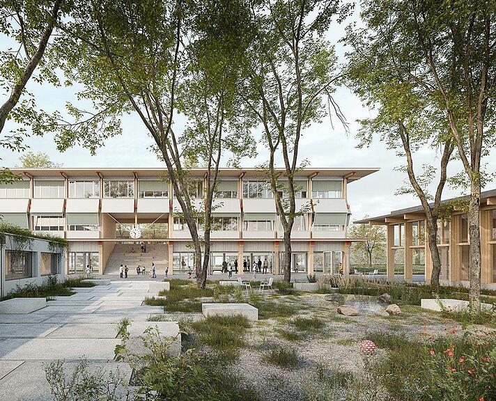 Die Schwimmhalle fungiert «als eingeschossiger Pavillon mit offenem Charakter und Ausblick auf die neugestaltete Spielwiese». Bei Bedarf könne die Schwimmhalle um drei Stockwerke für Schulräume erweitert werden. Beim Freiraumkonzept ist laut Mitteilung «besonderer Wert auf Biodiversität, Klimaschutz und die Einbindung von Schülerinnen und Schülern und Lehrpersonen in den Gestaltungsprozess» gelegt worden.