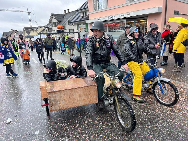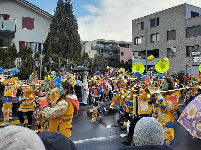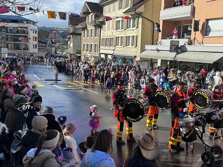 Punkt 14.30 Uhr ist auch der Umzug in Hünenberg gestartet, mit einem lauten Knall und der Guggenmusig Quaker - bei blauem Himmel und Regentropfen gleichzeitig. Die Besucherinnen und Besucher lassen sich die Stimmung derweil nicht vermiesen.