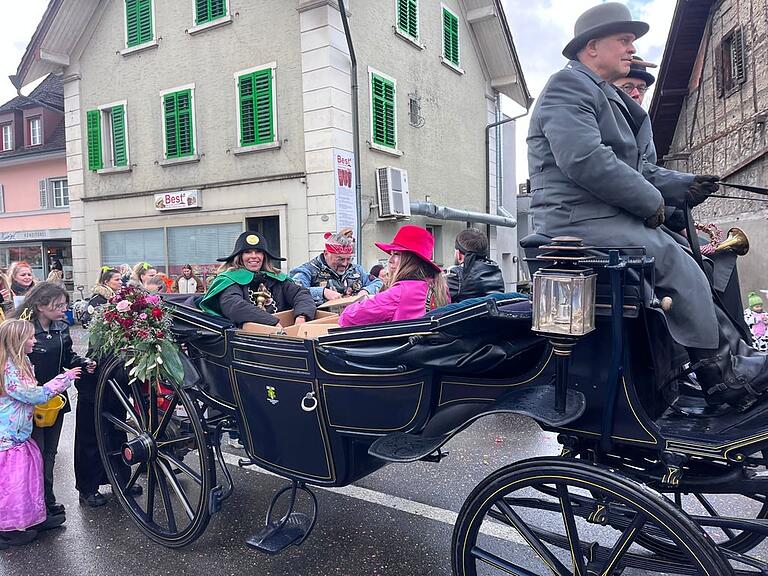 Das Zunftmeisterpaar der Fröschezunft: Denise und Fredy Graf in der Kutsche. Ganz schön vornehm, haben die doch das Motto «Die cheibe Töfflibuebe...»