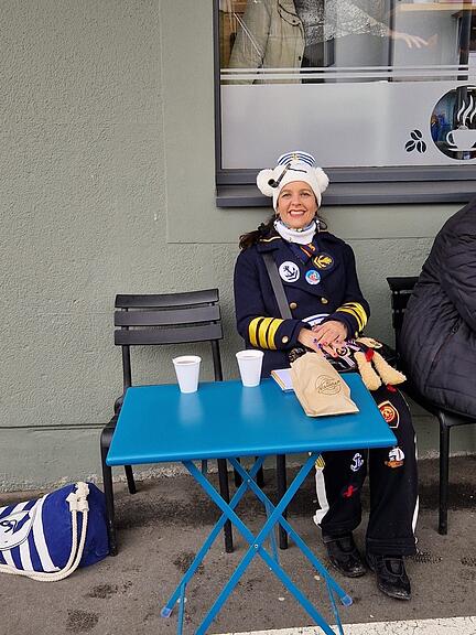 Unser Reporter schreibt dazu: «Z Triengen vor dem Umzug trinkt sich die Zweiergruppe, bestehend aus Yvonne und Pinzi aus Brönznau, den Umzug zurecht. Ihr Motto: Sonne im Herzen, Flausen im Kopf. In 28 Minuten gehts los.»