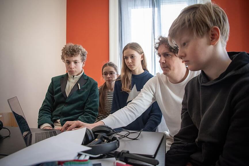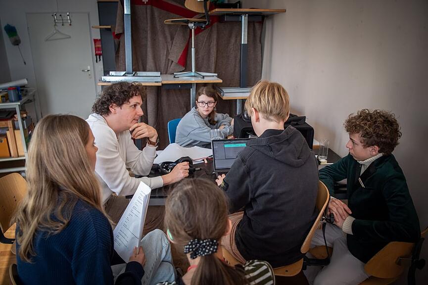 Projektwochen wie diese beginnen für Bregy mit dem Aufbau: Technik einrichten, Mikrofone testen und den Schülerinnen und Schülern die Grundlagen erklären. Die Geschichten haben die Klassen im Vorfeld gemeinsam mit den Lehrpersonen entwickelt, erklärt er. An der Montessori-Schule in Luzern reichten die Themen von Sagen und Geistergeschichten bis zu historischen Stoffen und Krimis.