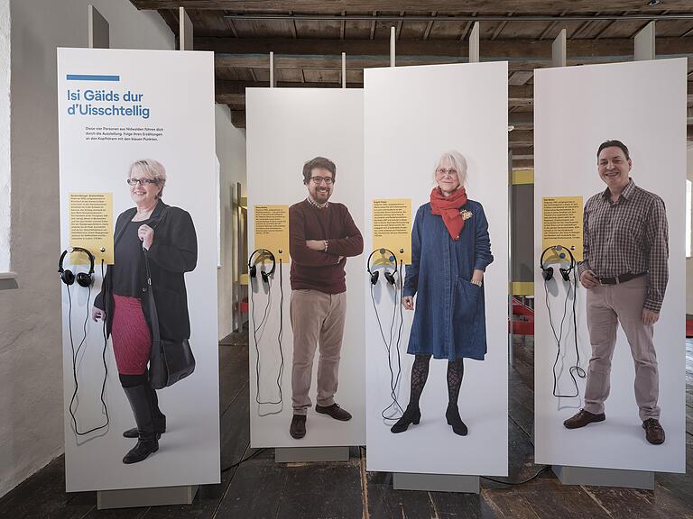 Über ihren Konterfeis ist gross und deutlich zu lesen: «Isi Gäids durd Uisstellig.» Obwohl man das eher neudeutsche denn urschweizerische Wort «Gäids» in klassischen Mundartwörterbüchern vergeblich sucht, wird einem bald klar, womit die vier einen überraschen wollen: An den Audiostationen plaudern sie über ihren persönlichen Umgang mit der Mundart. Und sie greifen auf recht amüsante Weise die fünf Themenbereiche der Ausstellung auf. Allein die Überschriften dazu machen neugierig: Dazugehören. Schimpfen und Fluchen. Lesen und Schreiben. Einst, heute und morgen – Hochdeutsch.
