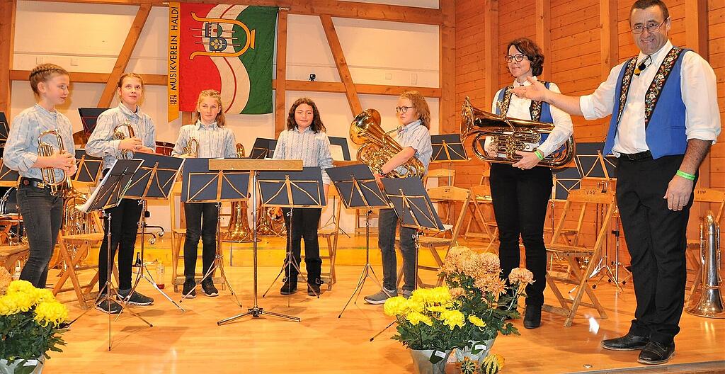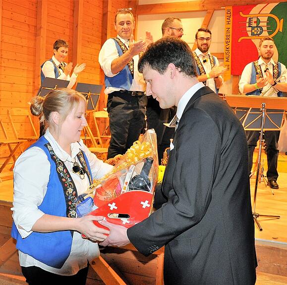 Die vier Jungmusikantinnen Melanie Bissig, Eliane Arnold, Tamara Bissig und Sarah Gisler zeigten dann in der Pause, verstärkt durch Carla Müller und Regula Arnold, was sie seit Kursbeginn im Mai bereits gelernt haben. In Abwesenheit von Musiklehrer Patrick Stadler leitete Sebi Gisler die junge Gruppe und das Publikum honorierte die bereits sehr gut gespielten Vorträge mit grossem Applaus. Hans Müller, Präsident des Musikvereins Haldi nutzte die Pause, um verdiente Ehrungen vorzunehmen – allen voran André Ritter, der am Abend sein 10. Konzert als Dirigent des Musikvereins Haldi leiten konnte. Ihm zu Ehren spielte das Corps, unter der Direktion des Vizedirigenten Toni Gisler, den vom einheimischen Komponisten Emil Kieliger komponierten Marsch «Haldifahrt», mit dem Wunsch, dass der Geehrte noch viele weitere Jahre die Haldifahrt antreten werde.