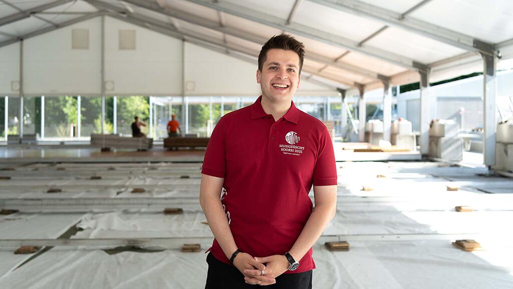 Zwischen dem neuen Sekundarschulhaus am Zirkusplatz und der Stadthalle in Sursee steht für die nächsten zwei Wochen ein Festzelt für 1500 Leute. Das Material ist am Dienstag und Mittwoch vor Pfingsten angeliefert worden, am Freitagmorgen hat der Bautrupp die grösste Arbeit dieses Bereichs mehrheitlich erledigt. «Das Schulhaus wurde erst per Schuljahr 2024/25 eröffnet und jetzt stellen wir schon ein Zelt auf den Pausenplatz. Die Schülerinnen, Schüler und Lehrpersonen werden es uns hoffentlich verzeihen, denn an den nächsten zwei Wochenenden und an Fronleichnam erleben wir viel gute Laune und grossartige Musik», sagt Mario Cozzio, 31, OK-Präsident des Luzerner Kantonal-Musikfests, das unter dem Motto «Taktvou vereint» stattfindet.