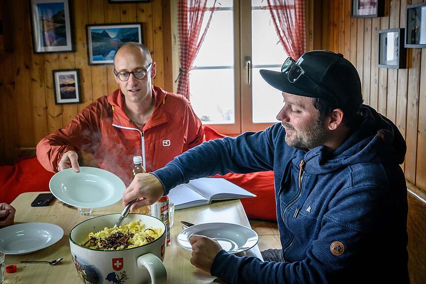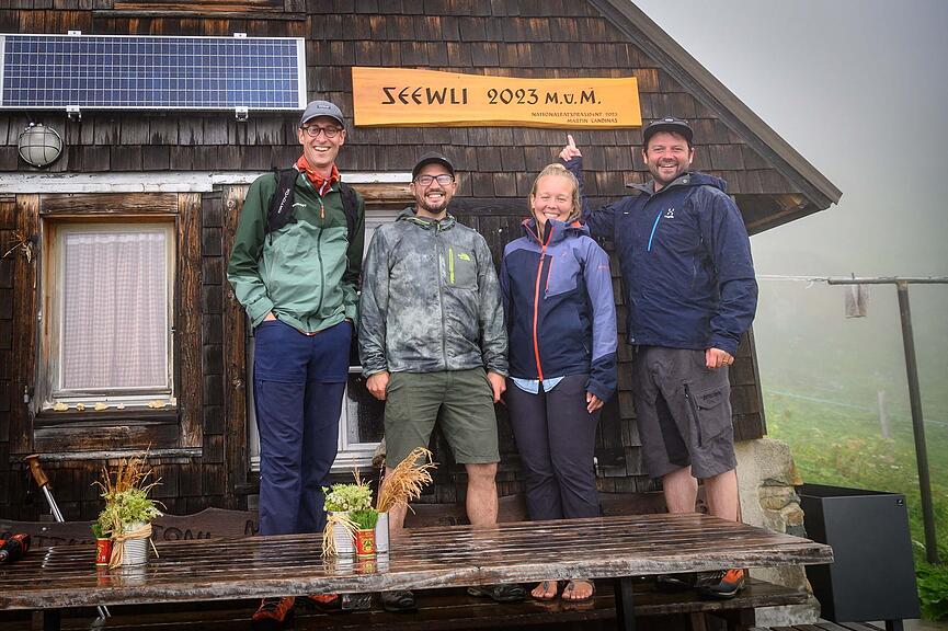 Als sie mit dem Grat den höchsten Punkt erreichten, hatten sie den anspruchsvollsten Abschnitt ihrer Wanderung bereits hinter sich. Sie mussten noch gut 200 Höhenmeter absteigen, um den Seewlisee und die Alphütte zu erreichen, was zügig gelang. Wahrscheinlich fiel ihnen der Abstieg leicht, da sie sich auf das bevorstehende Mittagessen freuten. Rückblickend stimmte die Planung perfekt. «Kaum waren wir bei der Hütte angekommen, änderte sich das Wetter genau wie vorhergesagt», erinnert sich Stadler. «Nebel zog auf und es fing an zu regnen.» Deshalb wurde beschlossen, mit der Übergabe zu warten und stattdessen von Älpler Peter Epp und Ramona Albrecht bekocht zu werden. Wie es Tradition ist, servierten sie Älplermagronen nach dem Rezept der Grosstante, zusammen mit hausgemachtem Apfelmus und einem «Kafi» zum Dessert.